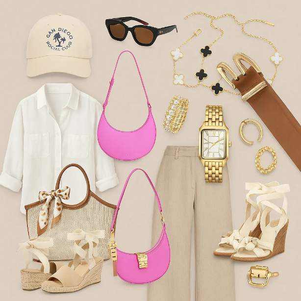 - Casual Chic: A white linen blouse paired with high-waisted jeans, white sneakers, and a structured tote.