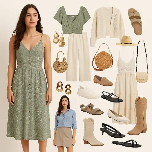 - Evening Elegance: A wrap dress with block-heel sandals and delicate gold jewelry.